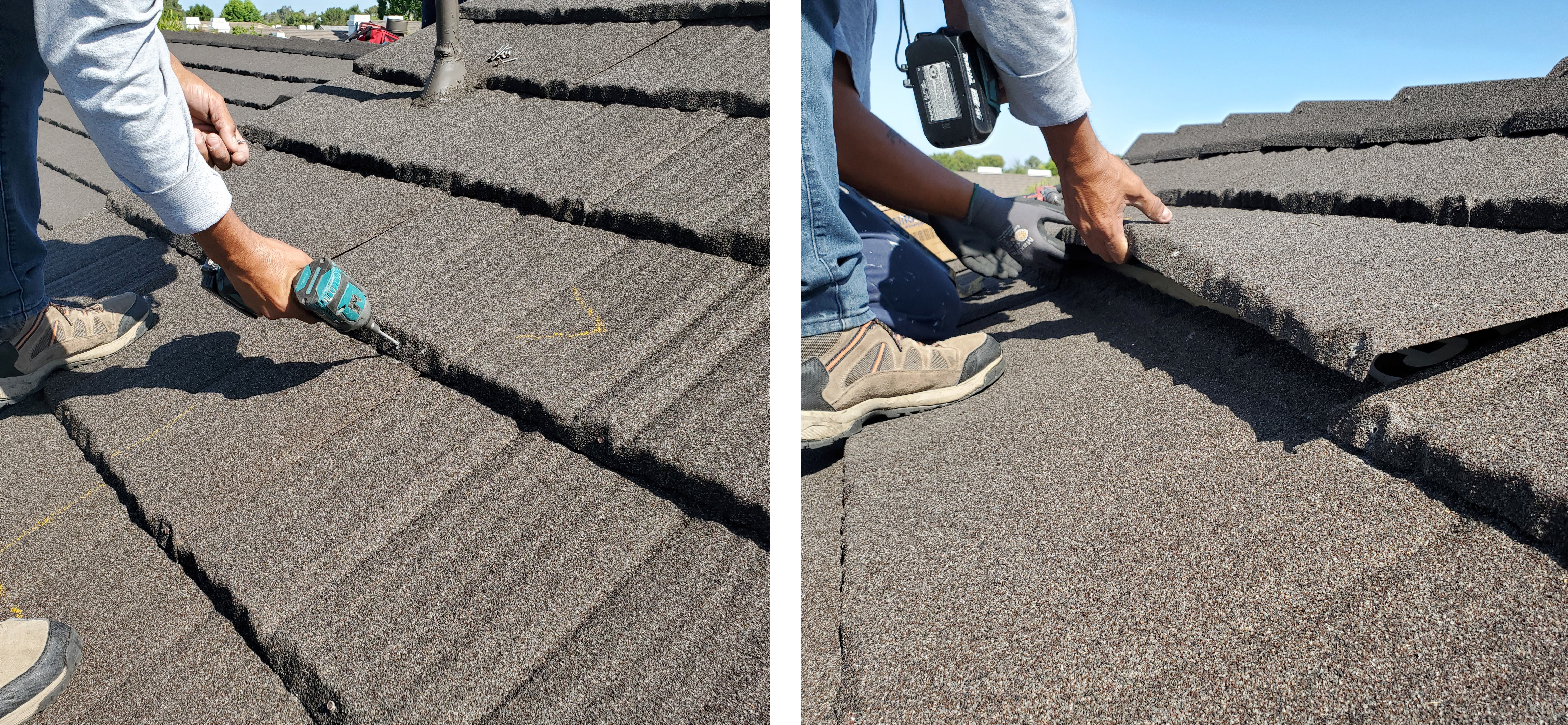 Prepare the roof by unfastening the nose of the overlapping panels. You only need to unfasten the bottom as the panels are flexible enough to be bent up. Leaving the back fasteners in place will make this easier. Unified Steel™ Stone Coated Steel roofs are installed using three methods: