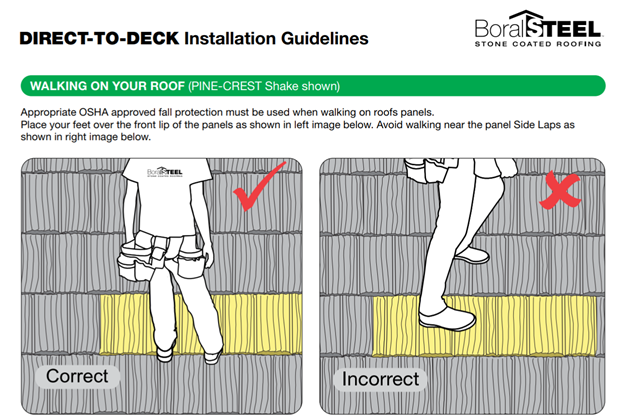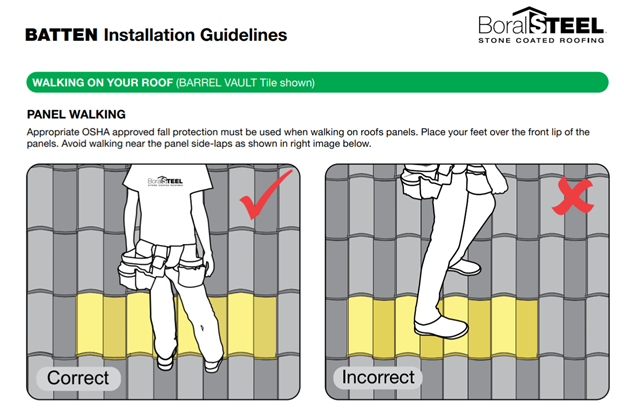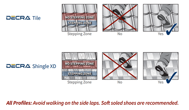 Roof manufacturers like Decra and Unified Steel (formerly known as Boral) have guides on how to walk on their Stone Coated Steel roofs, it’s rather simple and not too different from walking on Spanish tiles. The key is to step on where the panels are strongest which is always the top/bottom overlaps.